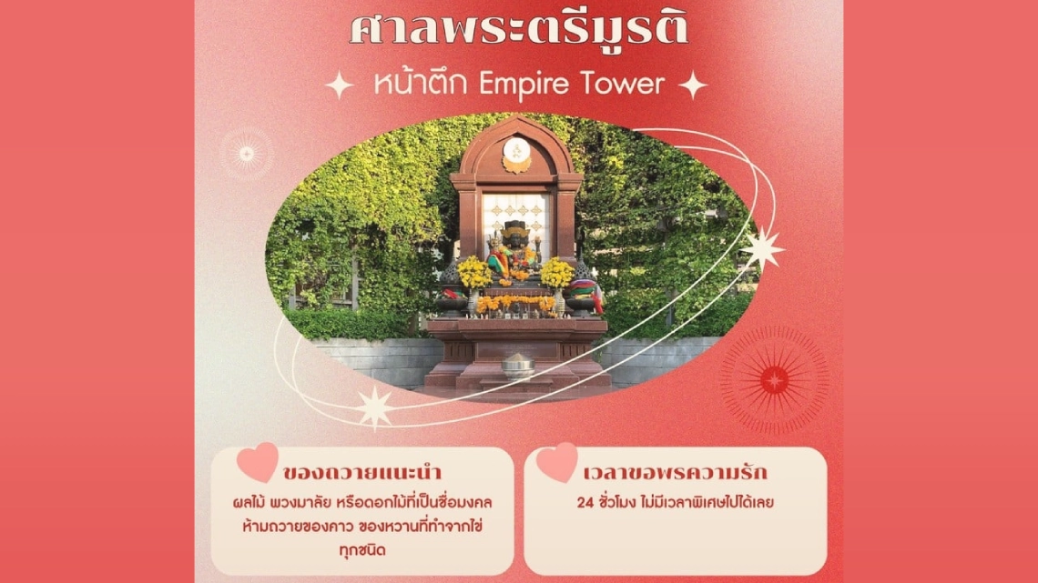 ศาลพระตรีมูรติที่ Empire Tower: ที่สุดแห่งความรักแห่งกรุงเทพฯ เมื่อเราค้นหาความรักในกรุงเทพฯ หลายคนอาจคิดถึงสถานที่ศักดิ์สิทธิ์ต่าง ๆ ที่เชื่อว่ามีอำนาจส่งเสริมความรัก. ในที่นี้, จะนำเสนอถึงสถานที่ที่มีความเชื่อถือในเรื่องความรัก, นั่นคือ ศาลพระตรีมูรติที่ตั้งอยู่หน้าตึก Empire Tower.