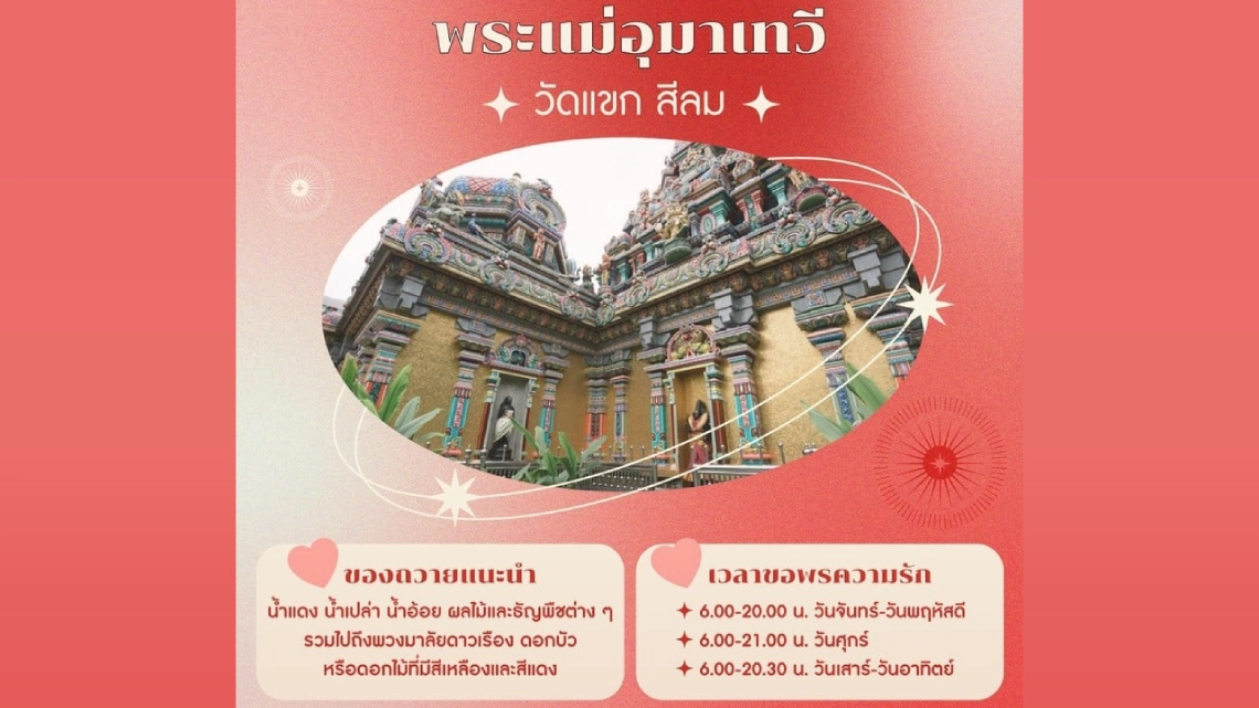 วัดแขก สีลม เป็นที่ทรงพลังและสามารถช่วยอุทิศความรักและความสมหวังให้กับผู้คนได้. การไปสักการะที่นี่ไม่เพียงแค่เรื่องขอพรความรัก, แต่ยังเป็นการยื่นความปรารถนาให้ความสำเร็จ, ความมั่นคงในการเงิน, และความเจริญรุ่งเรืองทางทำงาน.