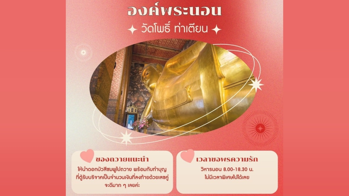 การขอความรัก ที่วัดนี้เป็นที่ชื่นชม ถ้าคุณกำลังมองหาความรักที่แท้จริง, การขอพรที่วัดโพธิ์ท่าเตียนอาจเป็นทางเลือกที่ดี. การกราบไหว้ที่ปลายเท้าขององค์พระนอนและการทำบุญด้วยเงินทองที่ลงท้ายด้วยเลขคู่เป็นที่นิยม, ทำให้ความปราถนาของคุณกลายเป็นจริงได้.